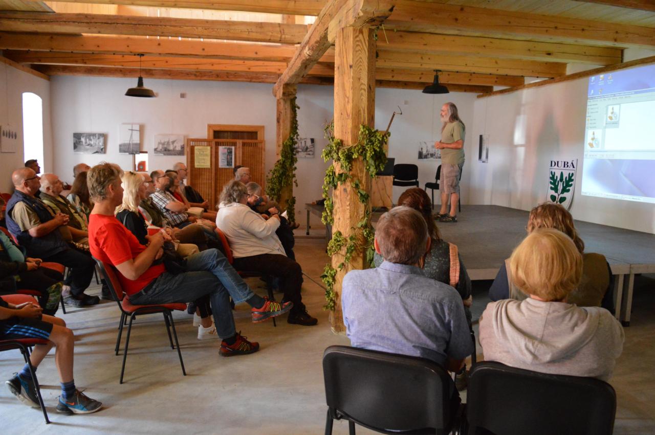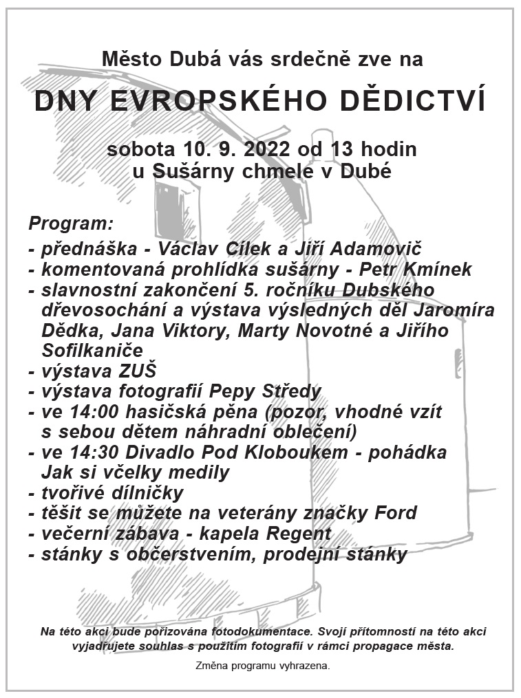 U příležitosti zářijových Dnů evropského dědictví měli všichni, kdo v sobotu 10. září 2022, přišli k sušárně chmele, možnost prohlédnout si nejen její nově upravené vnitřní prostory, ale také užít si bohatý odpolední program. Ten zahájila zajímavá přednáška Václava Cílka a Jiřího Adamoviče věnovaná Vlhošti. Následovala komentovaná prohlídka sušárny s výkladem našeho kolegy Petra Kmínka. Slavnostně zakončené bylo také Dubské dřevosochání, během jehož pátého ročníku vzniklo hned osm krásných dřevěných trpaslíků, kteří byli u sušárny vystaveni.