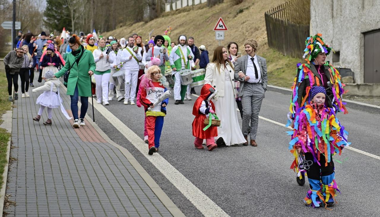 Po chvíli divokého bubnování se pomalu začal seskupovat dlouhý průvod, v jehož čele si vykračovali ženich s nevěstou a Masopustem