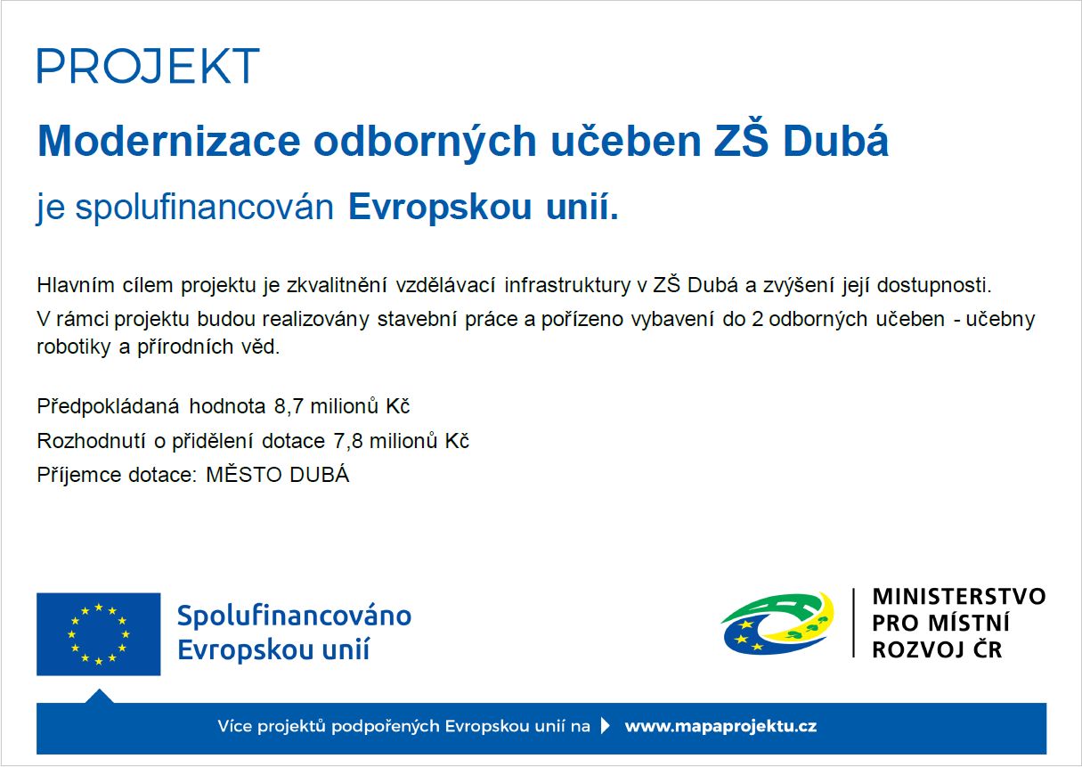Máme velkou radost, protože dorazilo Rozhodnutí o přidělení dotace na projekt Modernizace odborných učeben ZŠ Dubá, který bude spolufinancován Evropskou unií. Projekt bude fyzicky realizován v letech 2024-2025. Předpokládané způsobilé výdaje jsou 8,7 milionů Kč a přidělená dotace je ve výši 7,8 milionů Kč. Projekt bude realizovat město Dubá, které je i žadatelem o dotaci ve spolupráci se ZŠ Dubá, kde si připravili to, jak by dvě nové učebny (polytechniky a přírodních věd) měly vypadat. Vizualizace je na obrázcích.
