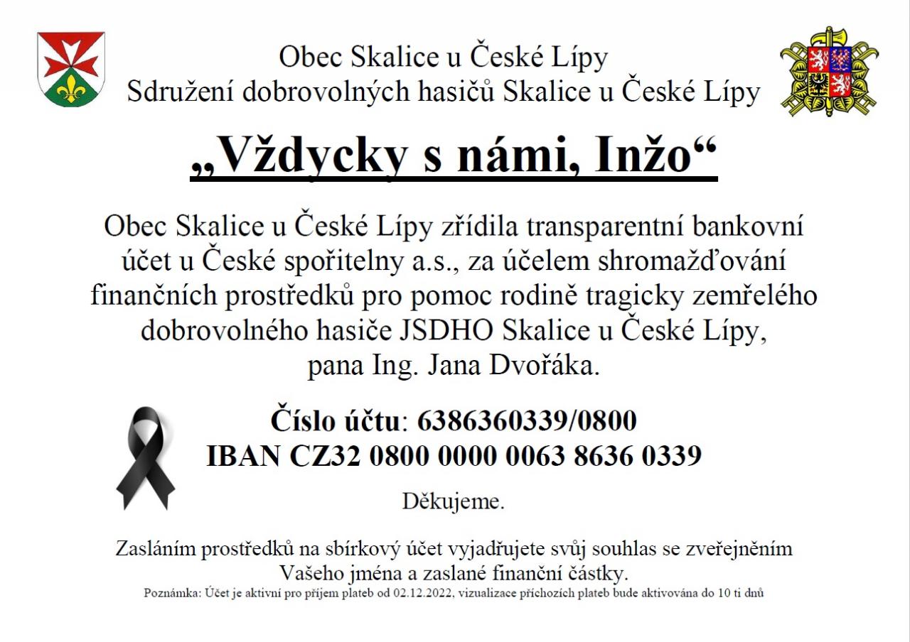 Obec Skalice u České Lípy zřídila transparentní bankovní účet za účelem shromažďování finančních prostředků pro pomoc rodině tragicky zemřelého dobrovolného hasiče Ing. Jana Dvořáka z JSDHO Skalice u České Lípy.