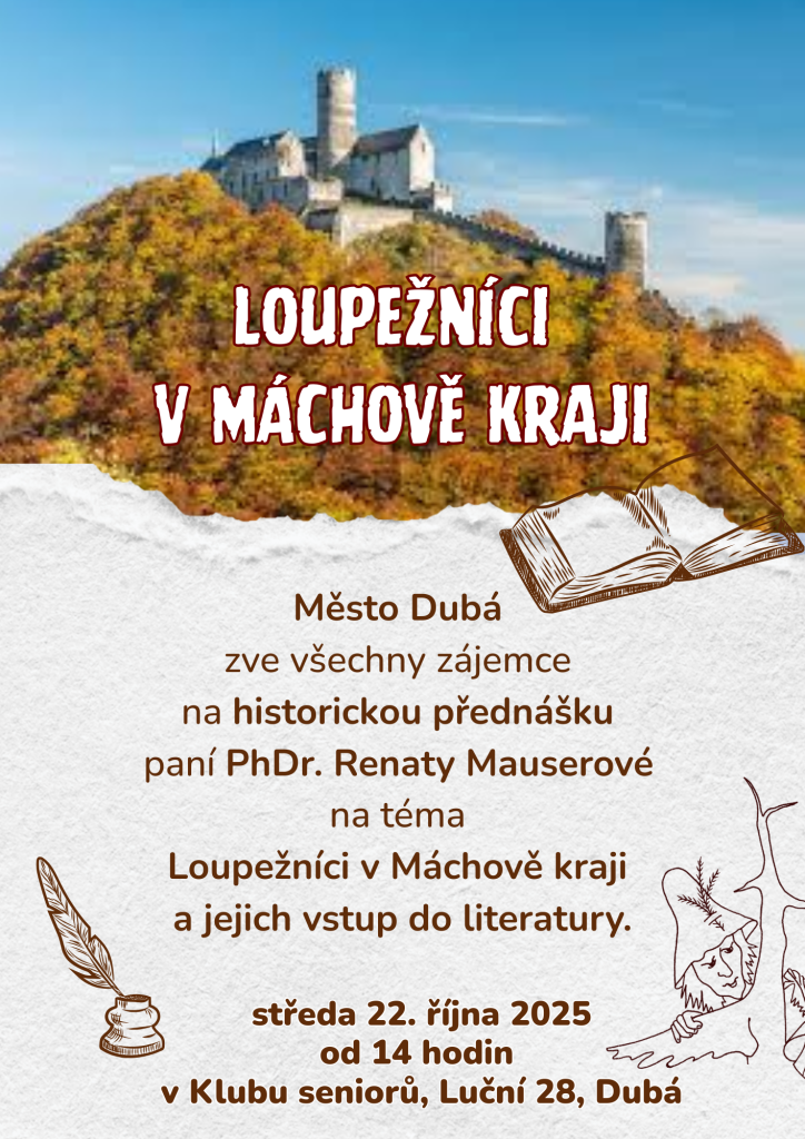 Zveme vás na historickou přednášku paní PhDr. Renaty Mauserové, která se bude konat ve středu 22. října 2025 od 14 hodin v Klubu seniorů, Luční 28, Dubá. Přednáška se zaměří na téma loupežníků v Máchově kraji a jejich význam v literatuře.