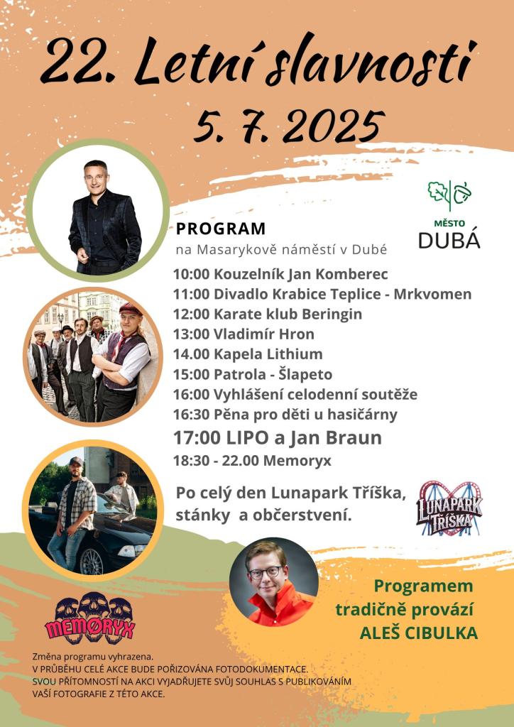 Město Dubá se chystá na tradiční letní slavnosti, které se uskuteční 5. července 2025. Pódium bude umístěno na náměstí, zatímco pouť se přesune do parčíku mezi samoobsluhou a restaurací u Nováků. Těšte se na zábavný program, který přinese radost a veselí všem návštěvníkům.