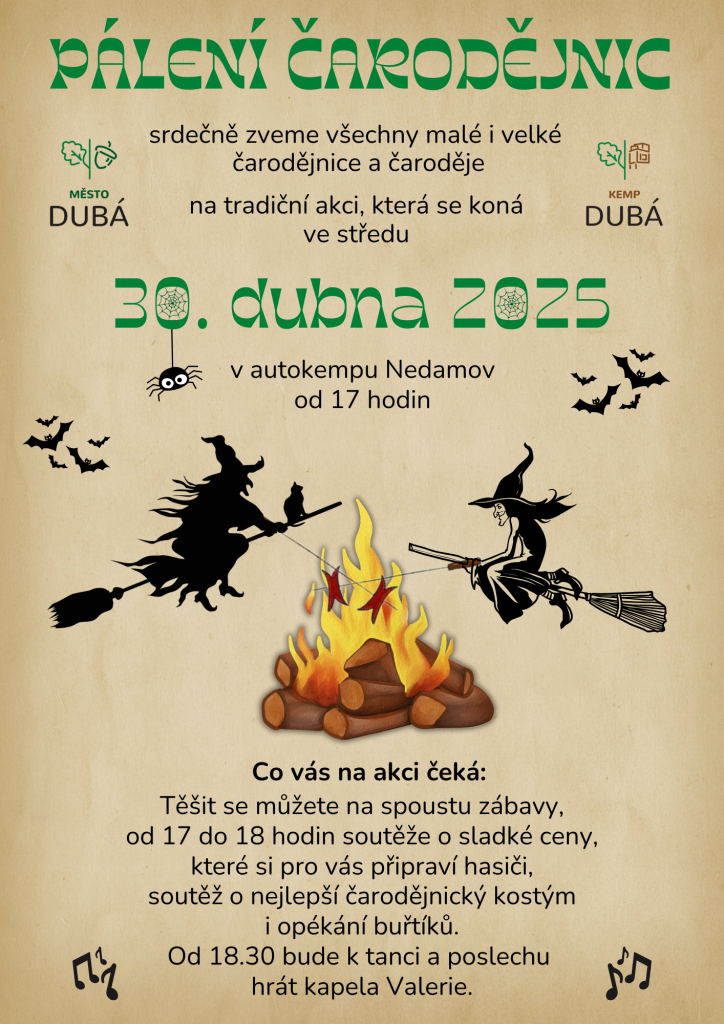 Zveme vás na tradiční Pálení čarodějnic v autokempu Nedamov v Dubé. Těšit se můžete na soutěže o sladké ceny, které si pro vás jako každý rok připravili dubští hasiči. Pokusíme se vybrat nejlepší čarodějnický kostým, což je ale nemožné, čeká vás také opékání buřtíků. Od 18:30 zahraje kapela Valerie.
