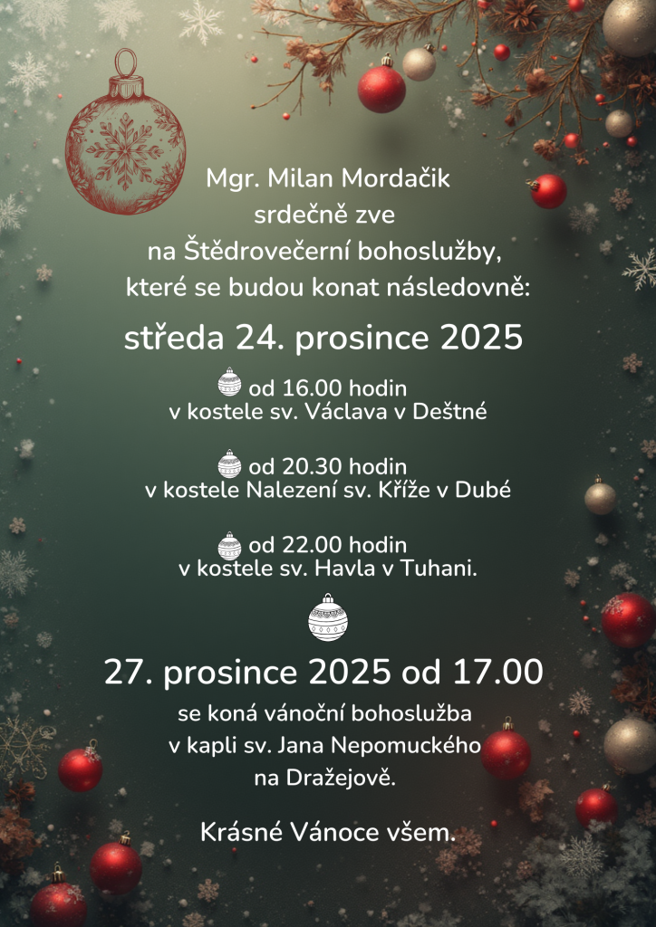 Štědrovečerní bohoslužby se konají ve středu 24. prosince 2025. První bohoslužba začíná v 16:00 hodin v kostele sv. Václava v Deštné. Poté následuje bohoslužba v kostele Nalezení sv. Kříže v Dubé od 20:30 hodin. Poslední bohoslužba se odehraje v kostele sv. Havla v Tuhani od 22:00 hodin. V kapli sv.