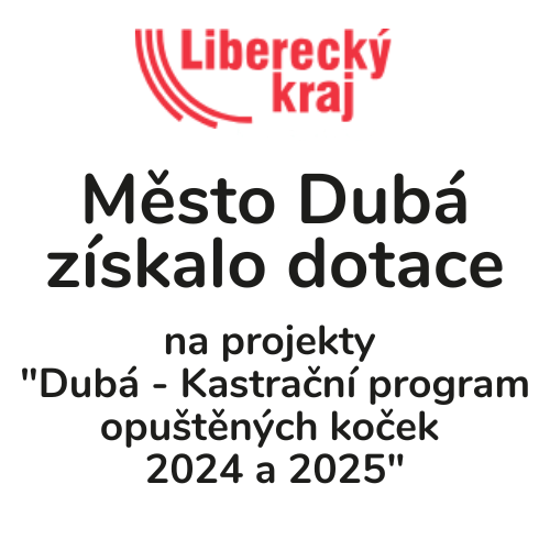 Dotační fond Libereckého kraje podpořil již dva projekty města Dubá z Dotačního fondu Libereckého kraje, oblast podpory 8. Životní prostředí a zemědělství, program č. 8.2 Podpora ochrany přírody a krajiny. Cílem projektů je zamezení nekontrolovaného množení opuštěných zdivočelých koček a předcházení šíření infekčních nemocí.