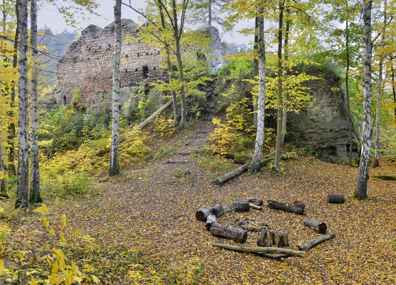 Nad mlýnem stojí zřícenina Chudého hrádku. Hrad byl osídlen již v druhé polovině 14. století, jak dokládají archeologické nálezy. V jeho předpolí se patrně rozkládalo široko daleko ojedinělé slovanské hradisko, jehož valy jsou již téměř zaniklé (jiné úvahy sem umísťují poplužní dvůr, náležející k hradu). První písemná zmínka o středověkém sídle pochází z roku 1391. Zpočátku se nazýval jen Hrádek, později se mu začalo říkat Chudý. V archivních mapách se lokalita nazývá Wustes Schloss, Pustý zámek, lidově také Poustka (někdy i Pauska či Buška). Naposledy je Chudý hrádek uváděn v roce 1622 při konfiskaci majetku české šlechty po bitvě na Bílé hoře, již jako pustý. Z hrádku se zčásti zachoval palác a dvě do skály zahloubené místnosti. Při skromnosti hrádku překvapí svoji monumentalitou tubus hradní studny. Volně přístupná zřícenina Chudého hrádku je památkově chráněná. Exponovaná poloha na vysokých skalních blocích ovšem vyžaduje opatrnost.