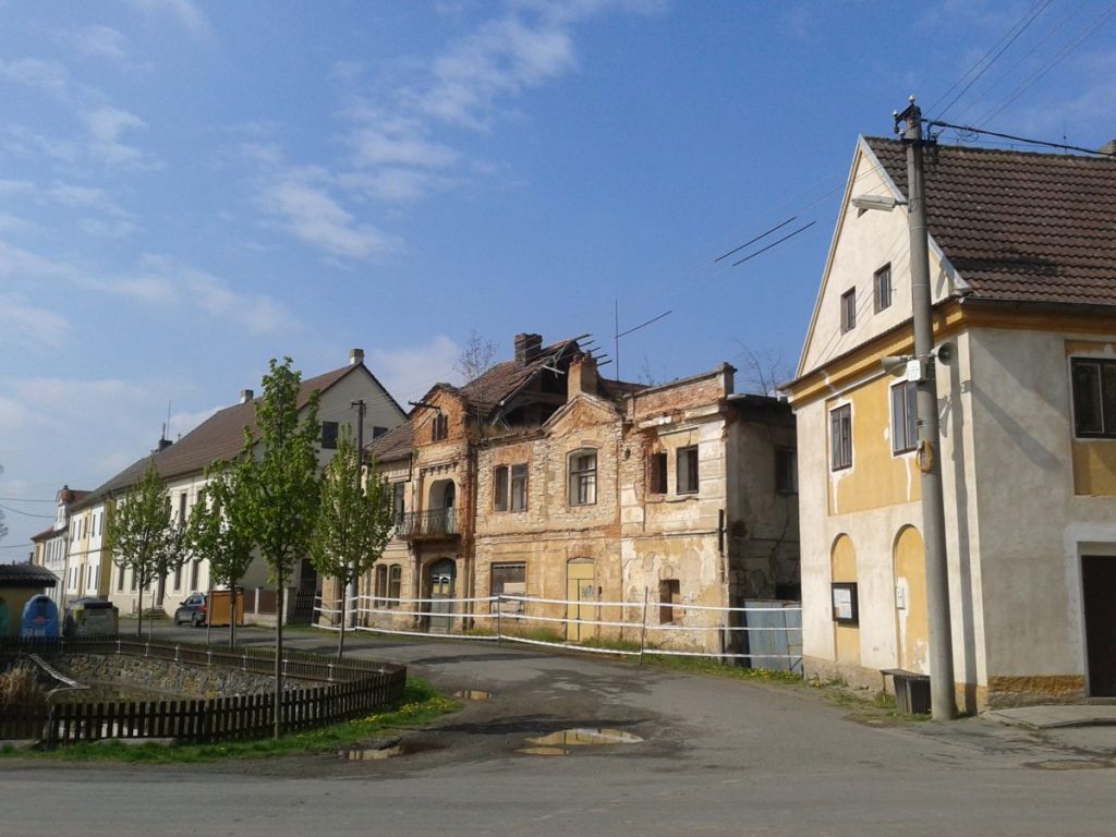 V dolní části návsi stojí pseudogotický kostel sv. Martina z roku 1878. Projdeme kolem nádrže, v řadě domů všimneme těžce poškozeného půvabného objektu čp. 46.