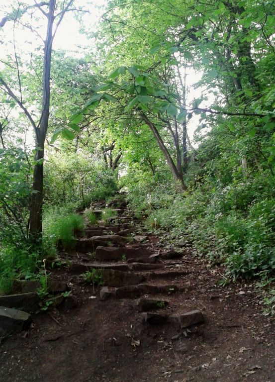 K vrcholu pak odbočuje doleva pěšina, označená červenou značkou hradu, po které dojdeme k odpočívadlu s lavicí pod stříškou. Pěšina dále již začne prudčeji stoupat, vpravo se můžeme pokochat zachovalým suťovým lesem, který tvoří habrové doubravy a suťové javořiny.