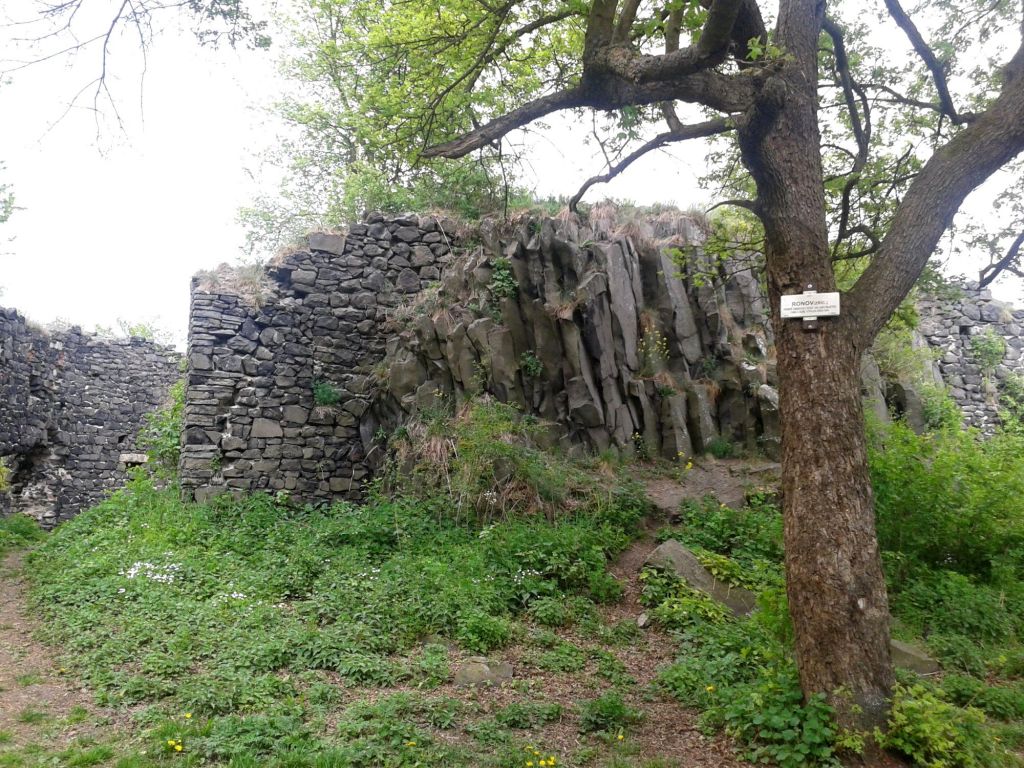 Všimneme si skalnatého výběžku obestavěného zdí, který je tvořený hranolovou odlučností vulkanické horniny - nefelinického bazanitu.